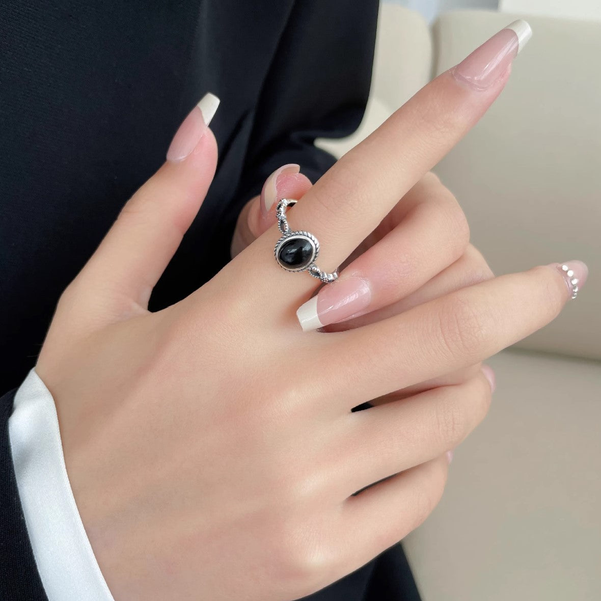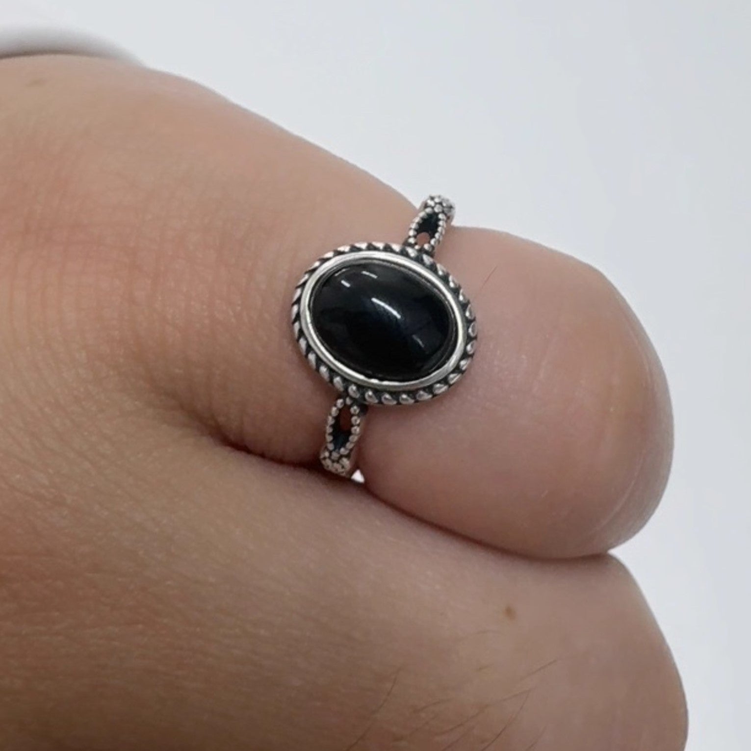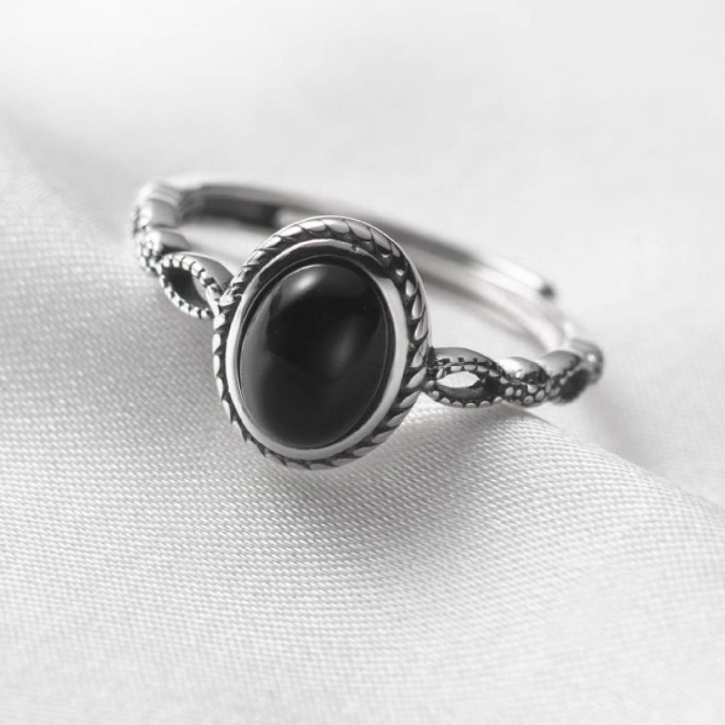 Elevate your everyday style with this captivating vintage-inspired black onyx ring, a perfect blend of bohemian charm and antique allure. Crafted from premium 925 sterling silver, the intricate twisted rope and beaded band wraps elegantly around your finger, featuring a glossy oval black onyx cabochon that catches the light with its deep, mysterious sheen. The open adjustable design ensures a custom fit for sizes 5-10, making it an effortless addition to your jewelry rotation—stack it for a layered look or wear it solo for understated sophistication.